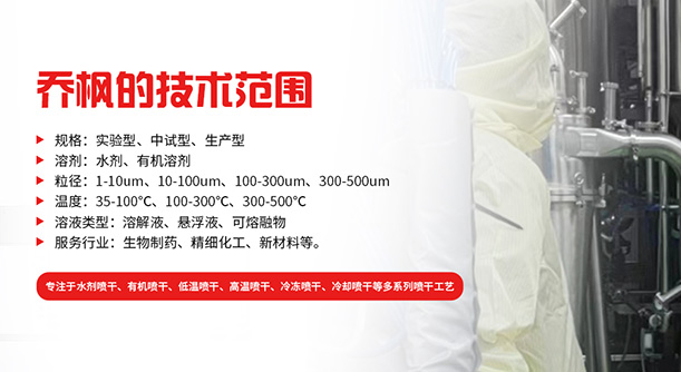 上海喬楓實業有限公司,成立于2012年,是從事噴霧干燥設備的研發設計、生產、銷售(小型噴霧干燥機,實驗型噴霧干燥機35℃低溫噴霧干燥機,有機溶劑噴霧干燥機低溫閉式循環噴霧干燥機、超細粉末噴霧干燥機噴霧冷凍干燥機、真空噴霧干燥機、氣流噴霧干燥機,噴霧造粒干燥機離心噴霧干燥機,沸騰制粒機等)和售后于一體的綜合性公司,本公司現成為一家致力于為生物制藥、精細化工、新能源、陶瓷造粒及食品工程等領域提供全套解決方案的整線交鑰匙工程企業。